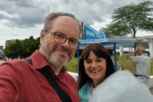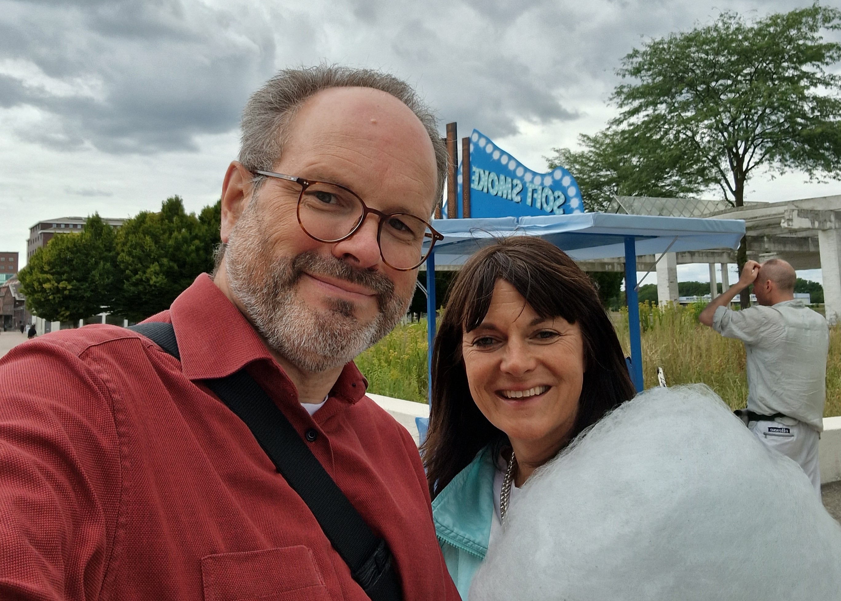 Bildbeschreibung: Frank Uekötter mit Franziska Pierwoss und Zuckerwatte der Geschmacksrichtung „Smog“ im Duisburger Innenhafen.