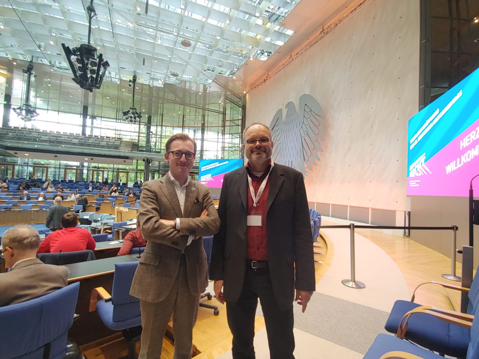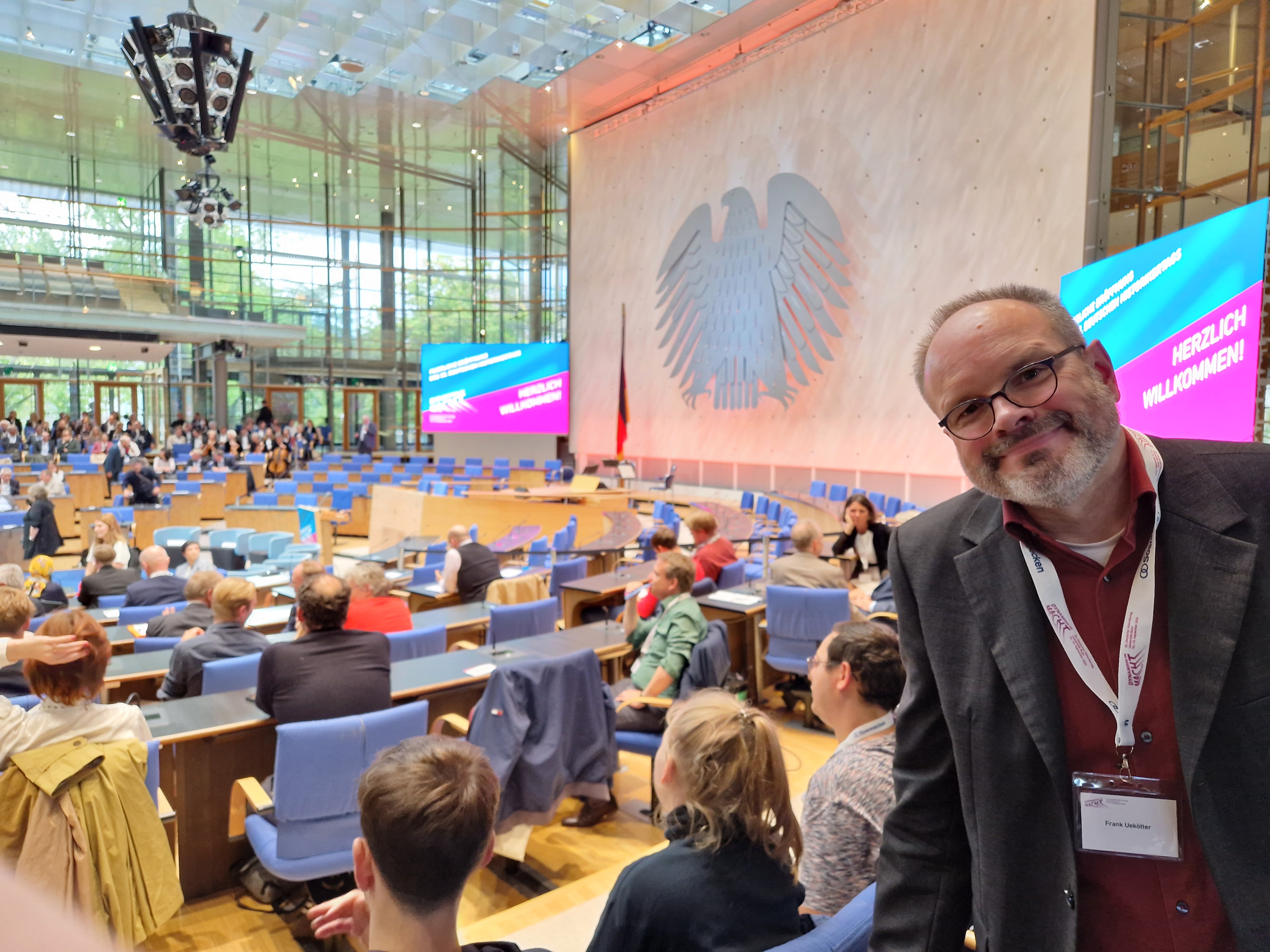 Es gibt an diesem Lehrstuhl exklusivere Meldungen in dieser Rubrik, aber der Historikertag ist nun einmal die Mutter aller Geschichtskonferenzen in Deutschland. Und unter den rund 2500 Teilnehmern befand sich auch Frank Uekötter, der bei Gelegenheit nicht nur die geschätzten Kolleginnen und Kollegen traf, sondern auch einen ehemaligen Mitarbeiter des Lehrstuhls. Hier sehen Sie ihn zusammen mit Phil Kilzer, ehemals erste Hilfskraft am Lehrstuhl, im Plenarsaal des Bundestages in Bonn, kurz bevor der nordrhein-westfälische Ministerpräsident Hendrik Wüst die Veranstaltung mit einem Festvortrag eröffnete. Dessen rhetorische Pointe: Wenn es um die Verteidigung der freiheitlichen Demokratie geht, verfügen HistorikerInnen über "Superkräfte". Davon ist nur leider auf diesem Foto so gar nichts zu sehen, weil wir es halt vor der Rede aufgenommen haben.